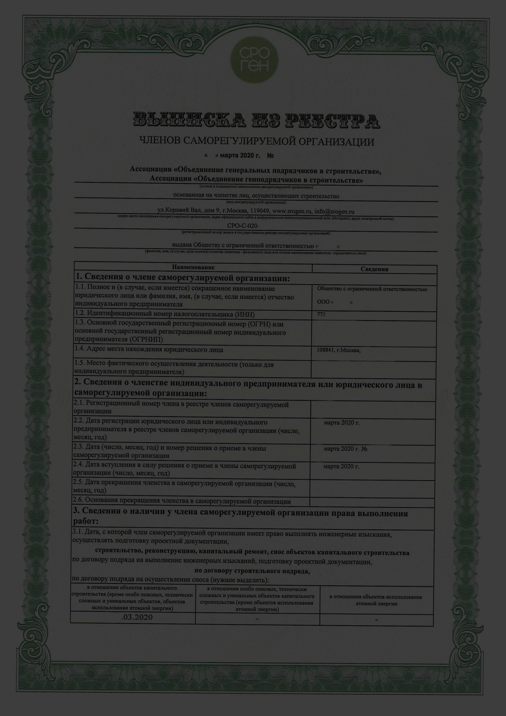 Допуск СРО по строительству на всей территории России. Дает право заключать контракты на сумму до 60 000 000 рублей.